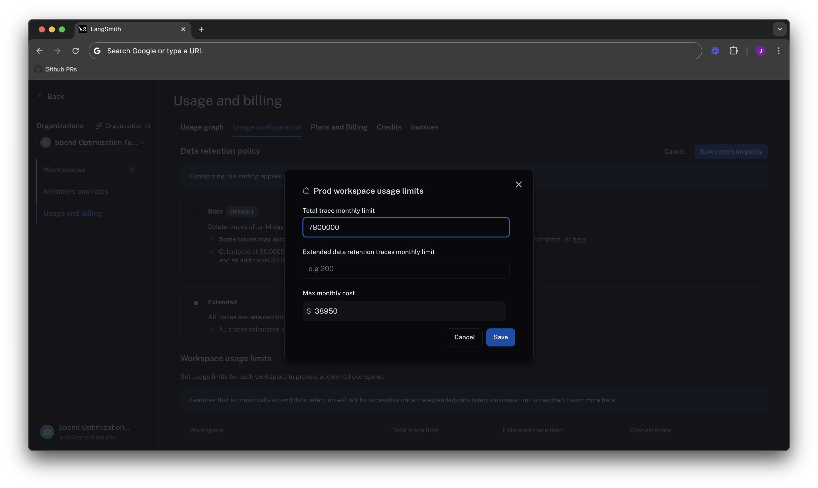 LangSmith has two usage limits: total traces and extended retention traces. These correspond to the two metrics we've been tracking on our usage graph. We can use these in tandem to have granular control over spend.